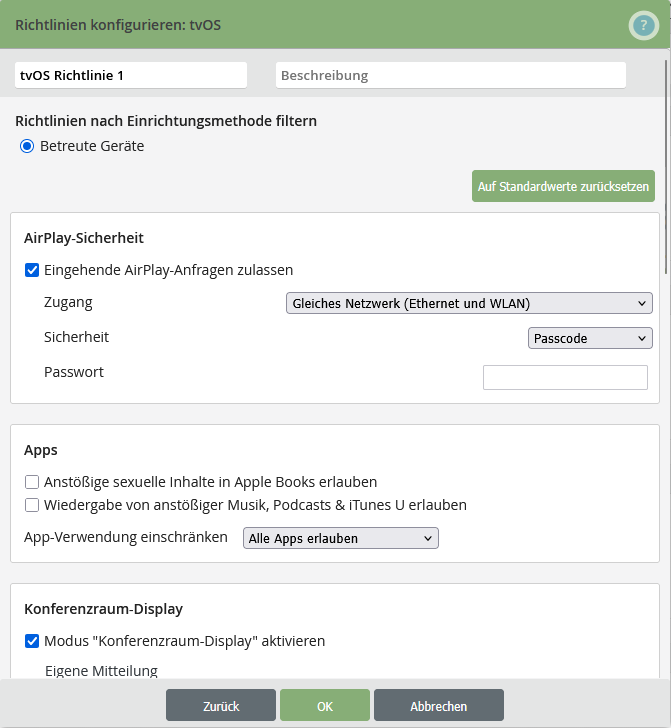 Apple TVs gewinnen zunehmend an Bedeutung als Präsentations- und Lehrmittel – insbesondere in Schulen, Hochschulen und Konferenzräumen. Mit dem neuesten Update unterstützt Cortado MDM nun auch Apple TV und bietet Administratoren eine einfache Möglichkeit, die Geräte zentral zu verwalten und abzusichern.