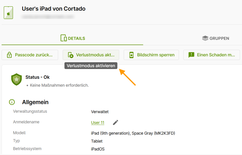 Ab sofort steht im neuen Verwaltungsportal auch der Verlustmodus zur Verfügung. Damit können Sie Geräte bei Verlust schnell absichern – inklusive Sperrbildschirm-Nachricht, Telefonnummer und Standortabruf, sobald sich das Gerät wieder meldet.