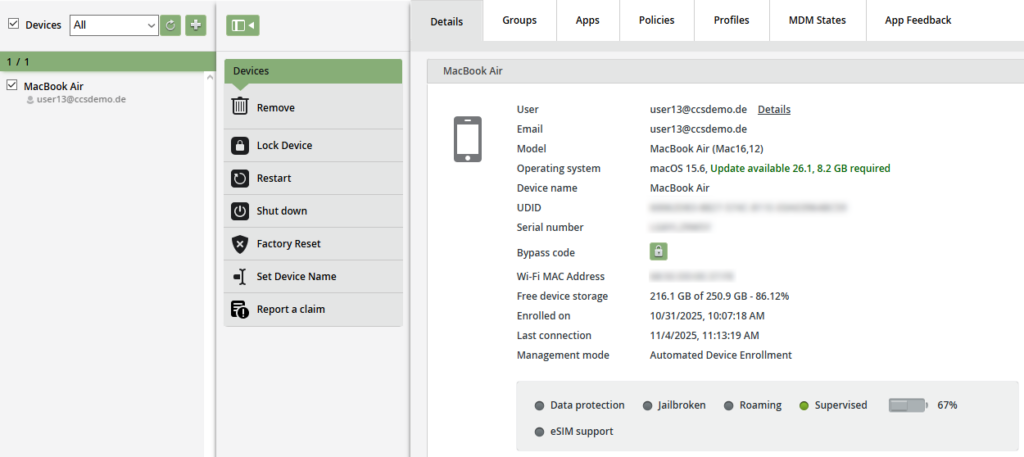 The central device dashboard gives you a complete overview of all registered Macs. Detailed device information is available at any time, and automatic or manual updates keep all systems consistently up to date. If necessary, devices can be locked, unlocked, or securely reset to factory settings directly from the management portal.