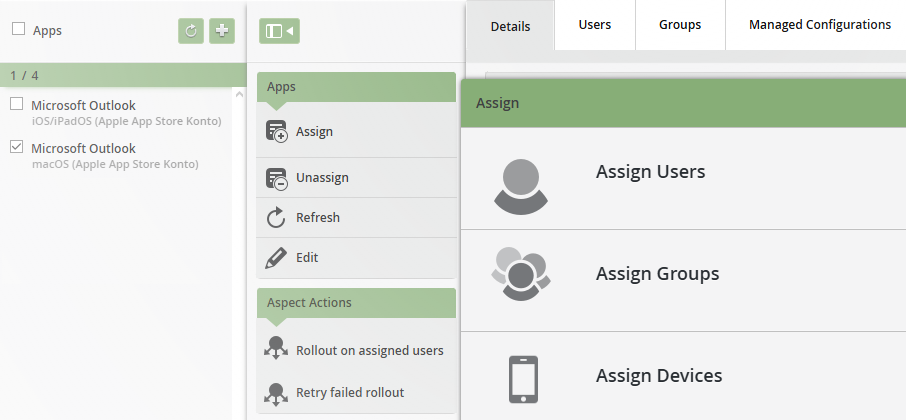 App distribution is just as straightforward: assign applications to your macOS devices via your Apple App Store account in the Cortado management portal and deploy them centrally. Managed app configurations ensure that apps are installed with predefined settings — enabling consistent and efficient device management.