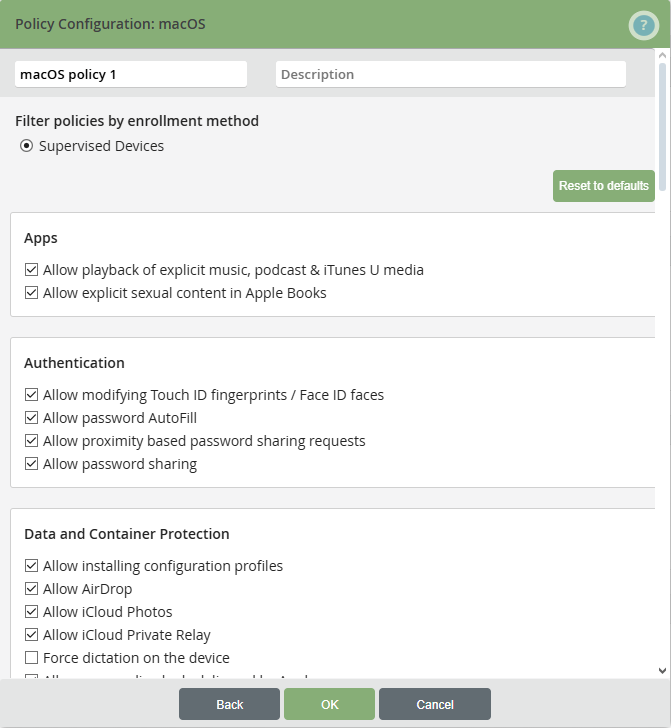 Additionally, Cortado MDM offers a wide range of policies to centrally control, secure, and standardize your company devices. This allows you to enforce password requirements, restrict insecure features, and meet essential data protection and security standards. You can find instructions for creating macOS policies here.
